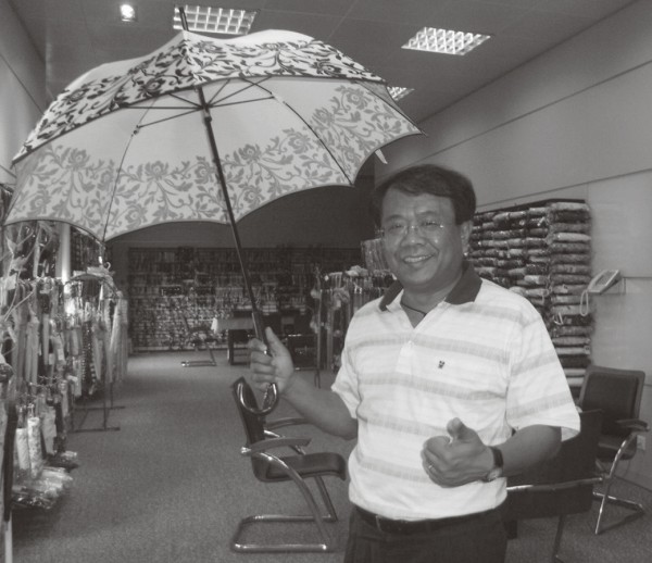 面对世界金融危机,曾长松的对策,一是产品创新,二是开发祖国大陆市场。样品间内,各式各样的晴雨伞争奇斗艳,令人目不暇接。曾先生如数家珍,一一打开这些伞向笔者介绍。产品确实独特独到,特色鲜明,十分精致,但是问到售价,不禁咋舌,每把几十元、几百元,贵的达一二千元,简直就是奇货可居的艺术品。曾先生表示,这些伞既是产品,也是艺术品。2009年初以来采用刺绣、贴布绣等民间工艺,巧妙地用到雨伞上,把工艺性、流行性、使用性融为一体,提高附加值两倍以上,市场价增3倍以上。工艺伞一个月生产1.5万打,投放市场后供不应求。曾先生说,这种战略叫价值创新,摆脱恶性竞争,别人没有,只有我有,就是唯一。为了实现唯一,产品就要少量、多样,摸准市场的脉搏,走在潮流的最前端,与时俱进,及时推陈出新。问到有多少新产品,曾先生介绍,2009年推出新产品1000多种,其中帽子100多种,晴雨伞700多种。伞的品种从开始的100多种,增加到现在的2万多种,这在全世界制伞行业中是独一无二的。曾先生自豪地表示,源太的伞品占日本高档伞的份额达二成以上,在中国大陆大城市一流百货商场内都能看到其身影,品质与信誉受到客户的青睐。
